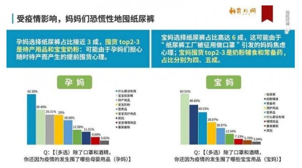 疫情期間,“少出門,多囤貨”成為大多數(shù)人的心理寫(xiě)照。除口罩、消殺類產(chǎn)品外,母嬰人囤貨的重點(diǎn)還是在奶粉、紙尿褲等寶寶生活必須品上。育兒網(wǎng)發(fā)布的《“新冠肺炎”疫情下的母嬰生活現(xiàn)狀報(bào)告》顯示,孕媽囤貨的top3分別是紙尿褲、待產(chǎn)用品和寶寶奶粉。寶媽囤積紙尿褲的力度更大,有超過(guò)60%的媽媽在疫情期間囤紙尿褲,奶粉輔食和常備藥也是他們囤貨的重點(diǎn)。