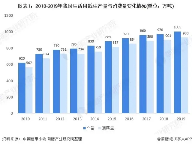 根據(jù)中國造紙協(xié)會在歷年《造紙工業(yè)年度報(bào)告》中披露的數(shù)據(jù),2010-2019年我國生活用紙的生產(chǎn)量與消費(fèi)量整體上呈現(xiàn)逐年增長的態(tài)勢。2019年,我國生活用紙產(chǎn)量為1005萬噸,較2018年增長3.61%;消費(fèi)量為930萬噸,較2018年增長3.22%。