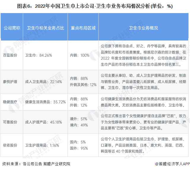衛(wèi)生巾行業(yè)的上市公司中,不同公司業(yè)務(wù)區(qū)域布局存在較大差異,其中百亞股份境內(nèi)業(yè)務(wù)占比最大,依依股份在國(guó)外業(yè)務(wù)布局上則更為積極;同時(shí),百亞股份衛(wèi)生巾業(yè)務(wù)占比最高,衛(wèi)生巾經(jīng)營(yíng)最為集中。