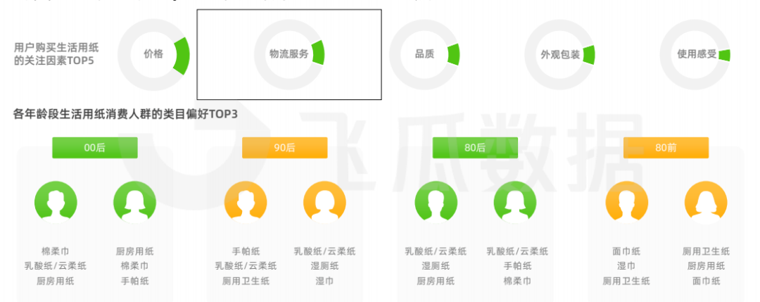 在購(gòu)買(mǎi)關(guān)注點(diǎn)方面,除了價(jià)格外,紙品的品質(zhì)、外觀包裝和使用感受也是影響消費(fèi)者購(gòu)買(mǎi)的關(guān)鍵因素。相比80年代的用戶,新時(shí)代消費(fèi)者們更注重使用體驗(yàn)等因素,且在生活用紙使用方面更多會(huì)選擇新興產(chǎn)品。