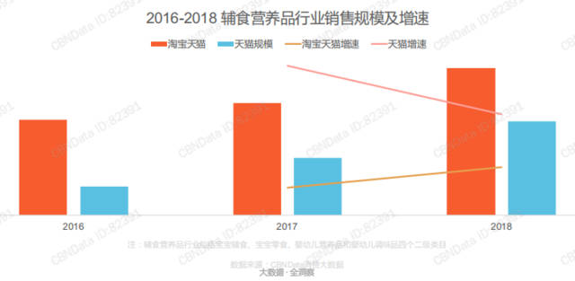 據(jù)CBNData數(shù)據(jù)顯示,2016—2018近三年間無論是在淘寶天貓還是天貓平臺上,輔食營養(yǎng)品的銷售規(guī)模都是在穩(wěn)步提升,特別是天貓平臺增速迅猛,且市場占比逐年大幅提升,2018年天貓平臺在整體淘系營養(yǎng)品銷售份額過半,遠遠超過50%。
